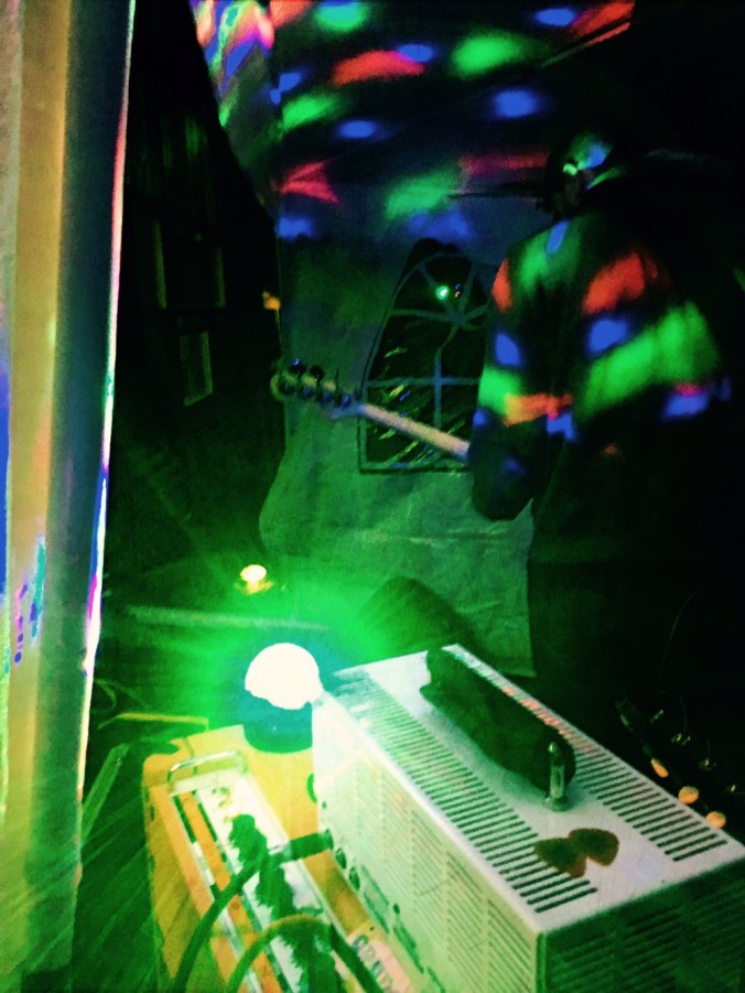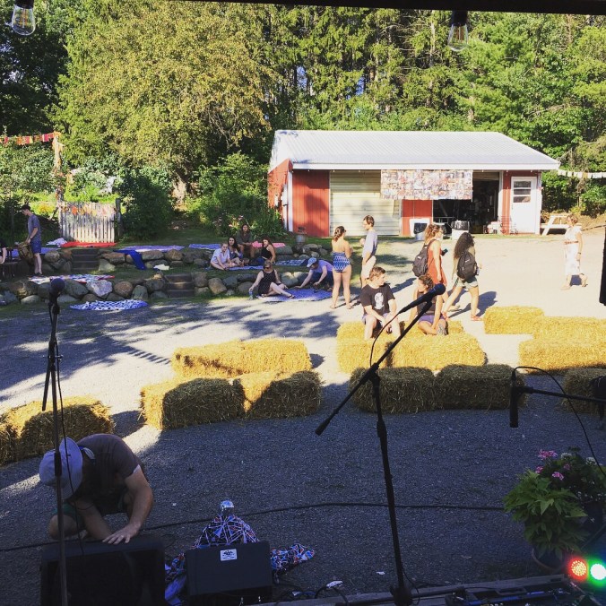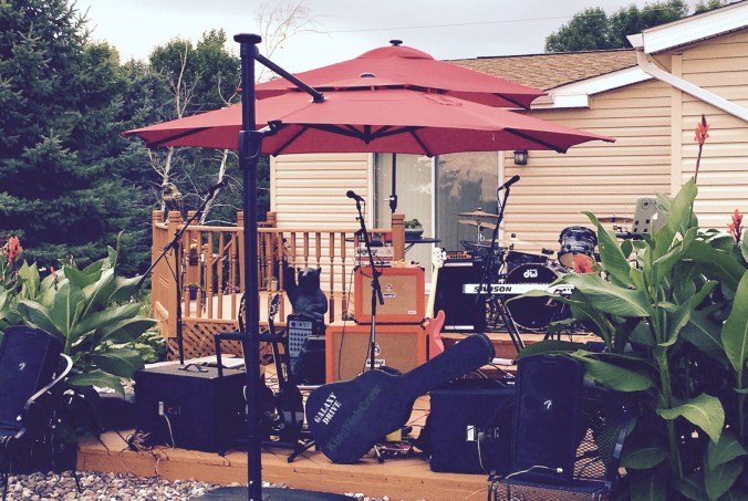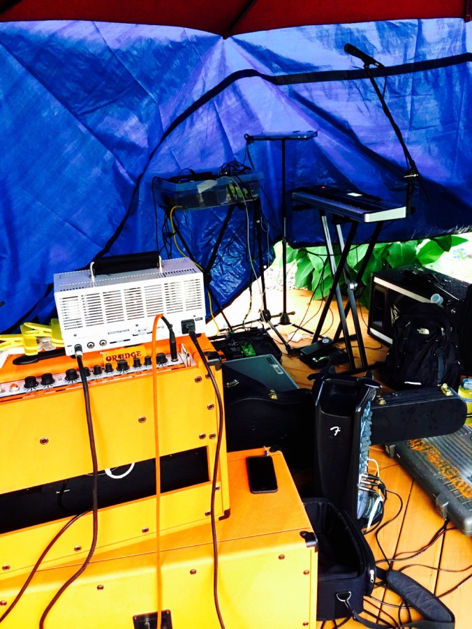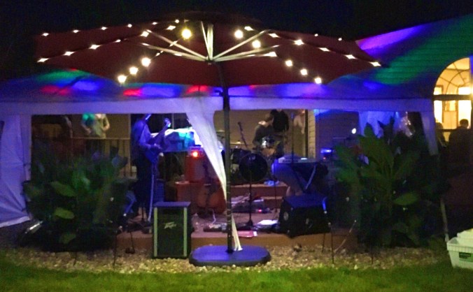When we arrived in Dexter, Beau was already there and it wasn’t raining at all. Our reliable weather app said 0% chance of rain till 10:00 pm. So when Shane arrived, we pushed our luck and set up our gear under a large and very nice, but in essence inadequate, deck umbrella. We had the stage set up and everything was powered and plugged in and we had just finished eating when it began to rain. There were a couple of gigantic tarps and we tossed one over the deck umbrella and stretched it to fit most of the stage. We grabbed another tarp and threw it over Beau’s drums and synched it down. We had nothing else to do, so we hung out under our stage tarp, which with the help of a small child (eating cheese puffs) became a fort, and we waited for the rain to pass. We were really hoping the rain would pass. And when it finally did, some of the party goers and the band set up a 10×20 tent structure. We slid off the large tarp, uncovered Beau’s drums and moved the tent onto the stage. It was going to work, if it didn’t rain too hard.
