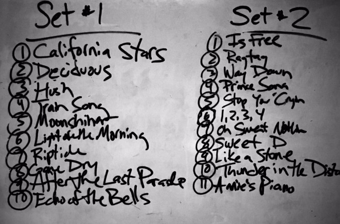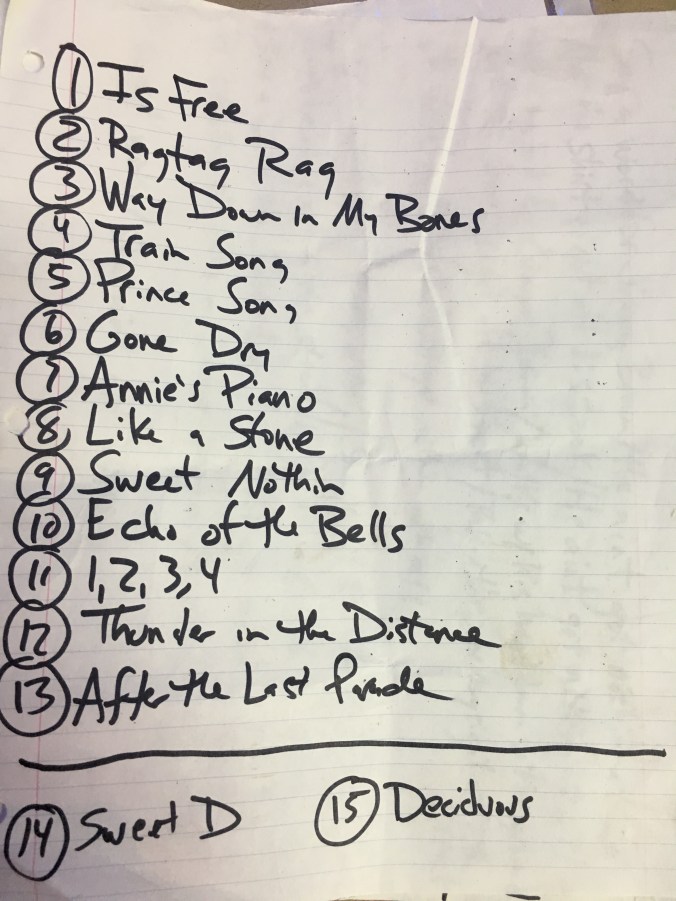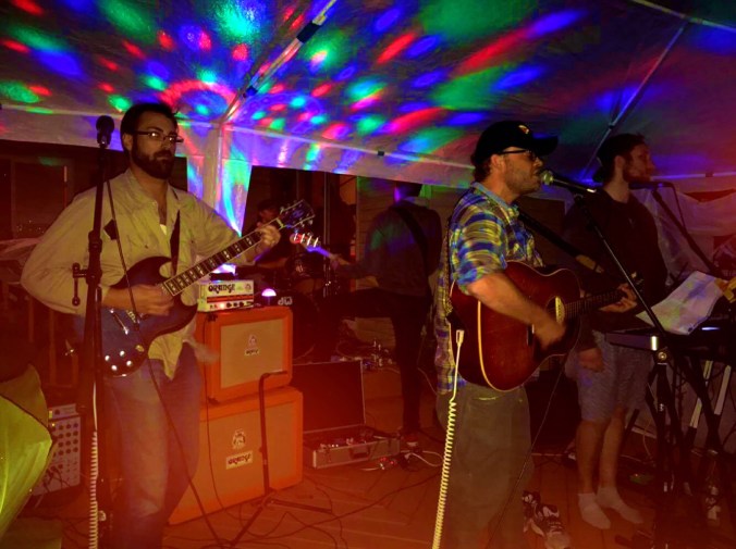 We didn’t waste any time after the tent was staked and secured before we started playing. We jumped right into the first set and worked on the mix on the fly. It was an experiment for us. We weren’t sure how the P.A. would sound outdoors and we had a couple new pieces that we didn’t quite know the full potential of. The set was fun and a little nerve racking with the damp and the clouds looming. But we played well and adjusted as best we could. The vocal level was low. We discovered this after the first set when everyone said, “Turn up the vocals.” So we made some adjustments and, under a crescent moon, we kicked into our second set. The mix was much better and the people let us know.